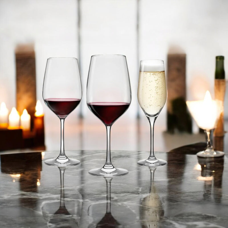Cristalería Montalcino (18 piezas): Copas finas para vino tinto, blanco y espumante, con diseño equilibrado y brillo excepcional. 6 copas Degustación, 650 ml.6 copas Vino, 495 ml.6 copas Champaña, 285 ml.Alemania.