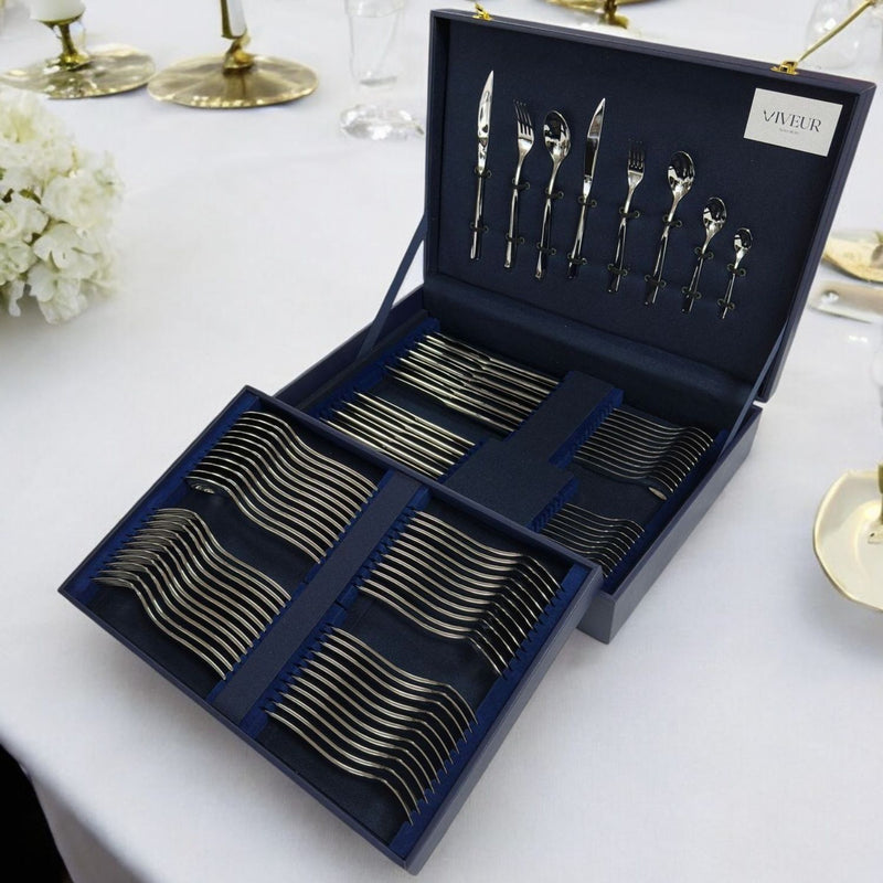 Lleva el lujo y la distinción a tu mesa con la cuchillería Versailles de VIVEUR, un set completo de 120 piezas para 12 personas que combina tradición europea y diseño ornamental inspirado en la elegancia del Palacio de Versailles.