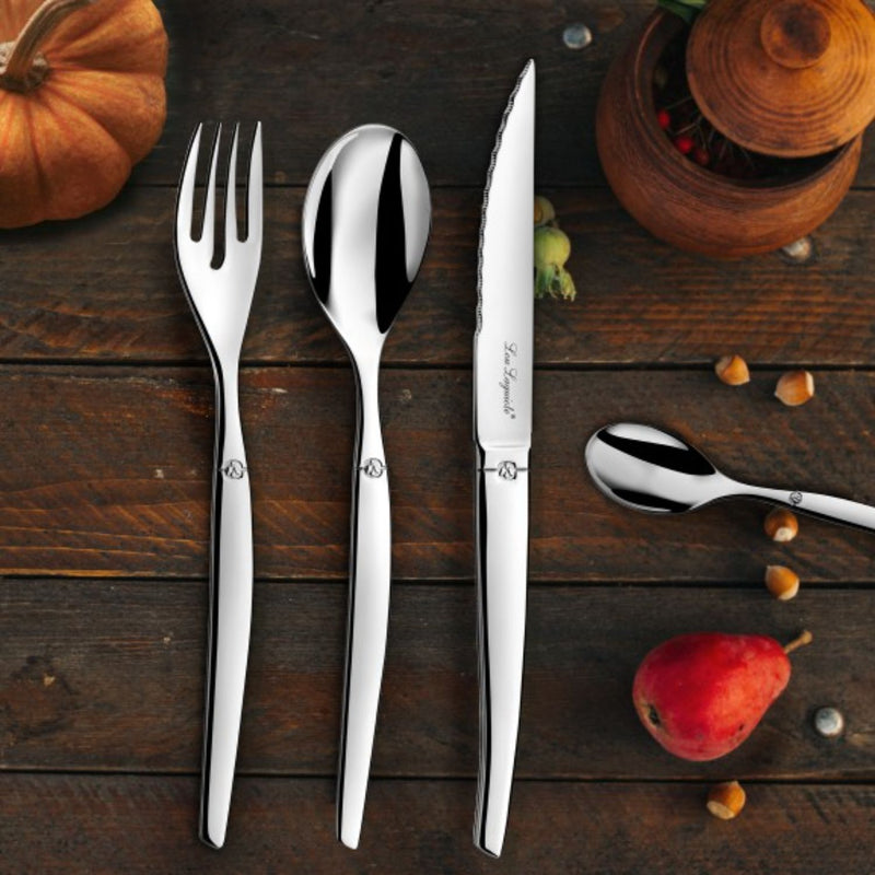 Elegancia francesa en tu mesa. Este exclusivo pack combina tres juegos esenciales de la línea JET de Lou Laguiole, con el característico diseño contemporáneo y el brillo inconfundible del acero inoxidable pulido.