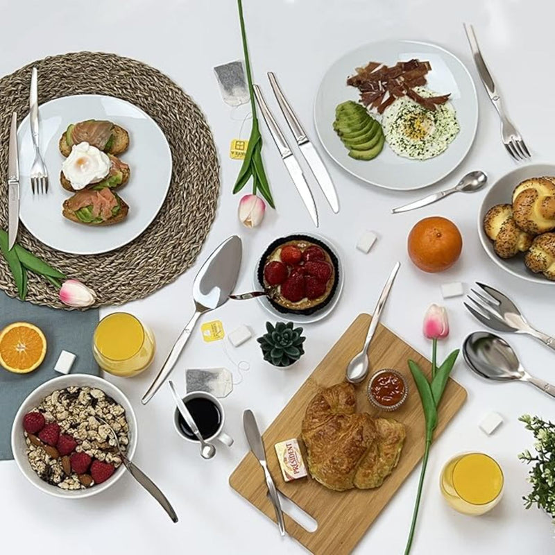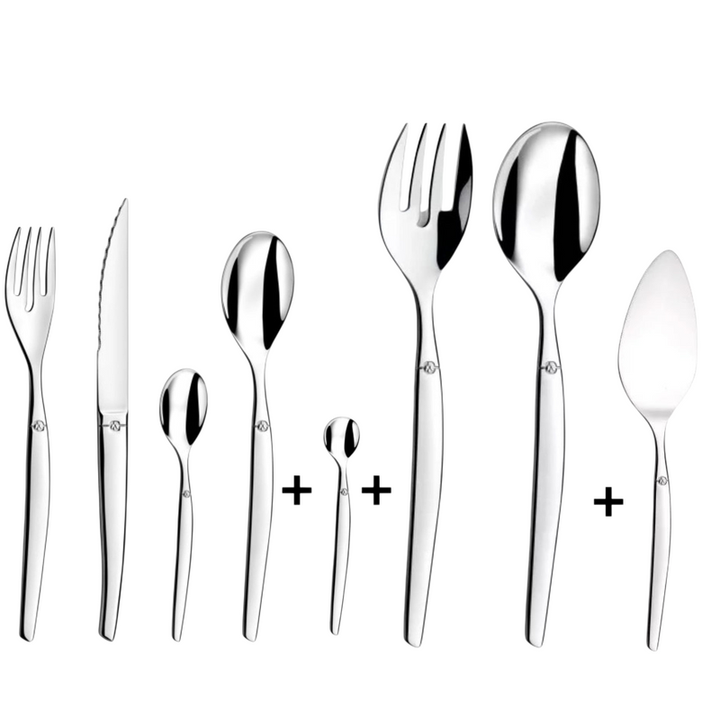 Elegancia francesa en tu mesa. Este exclusivo pack combina tres juegos esenciales de la línea JET de Lou Laguiole, con el característico diseño contemporáneo y el brillo inconfundible del acero inoxidable pulido.