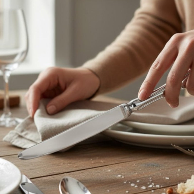 Fabricados en acero inoxidable 18/10, ofrecen mayor resistencia, durabilidad y un brillo superior que se mantiene en el tiempo. Su diseño estilizado y equilibrado aporta distinción tanto en una mesa diaria como en celebraciones formales.